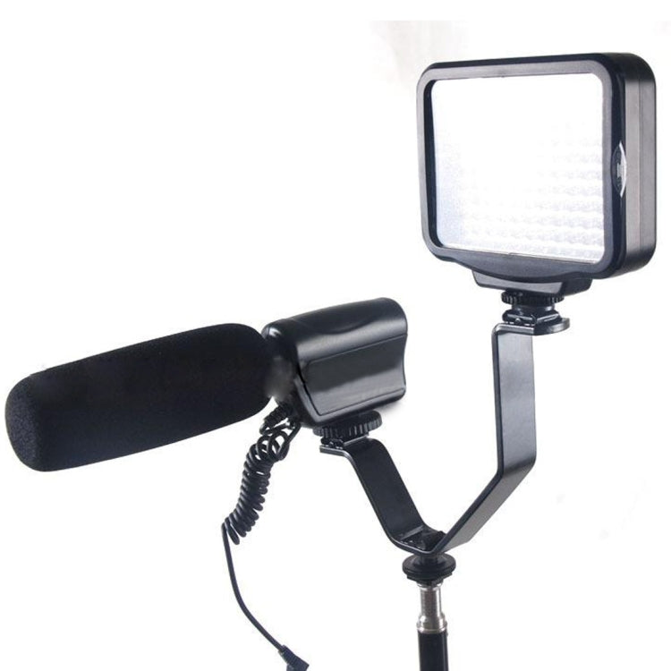 1) The triple shoe V-bracket mounts an a camera is accessory shoe to provide spaced mounting points for lights, monitors, microphones, or other accessories.
