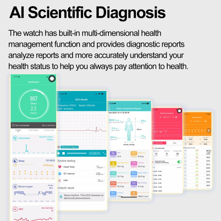 3. HRV function, AI medical diagnosis, Mett function, SOS emergency call function, temperature monitoring, blood oxygen monitoring, blood pressure monitoring