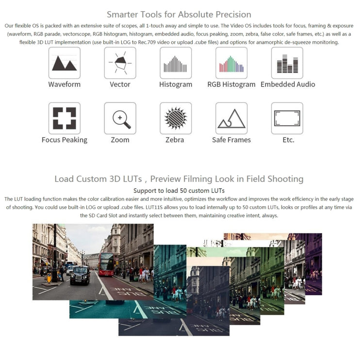 9. With Waveform, Vectorscope, RGB Histogram, Focus Assist, Monochrome etc. functions, can help you accurately exposure and focus every shot.