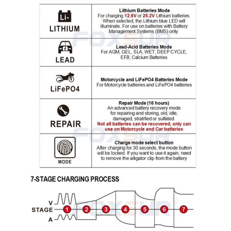 3. 7-stage chargers are suitable for most battery types including Calcium, Gel , AGM, Wet , Lithium, Lead Acid, LiFePo4 batteries. They may also help restore drained and sulphated batteries.