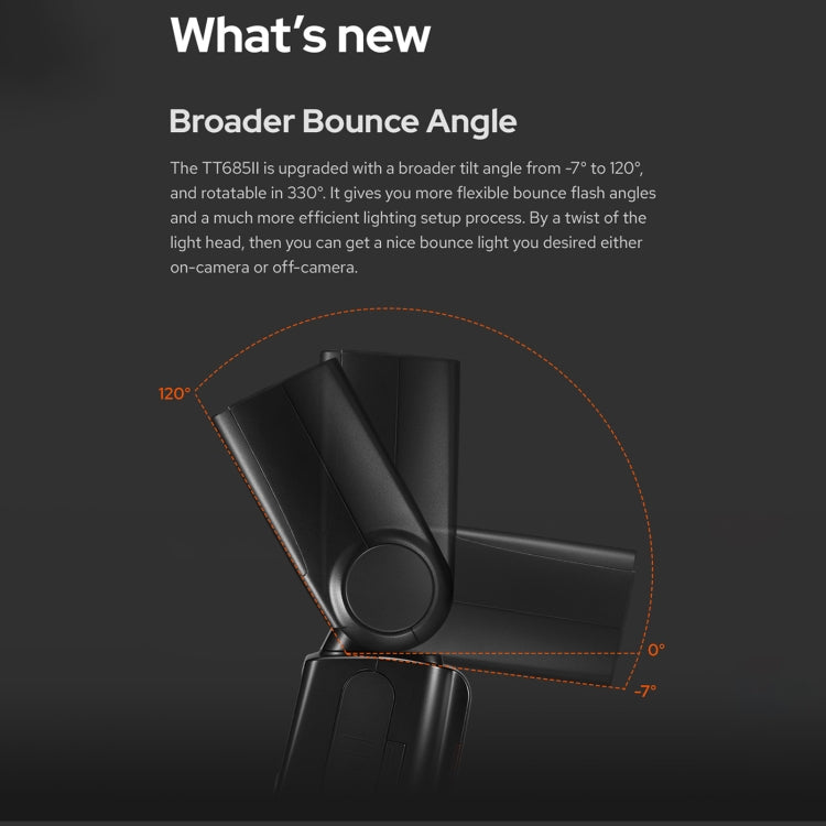 6. Manual zoom: Rotate/tilt the flash head, from -7 degrees to 120 degrees, can rotate 330 degrees