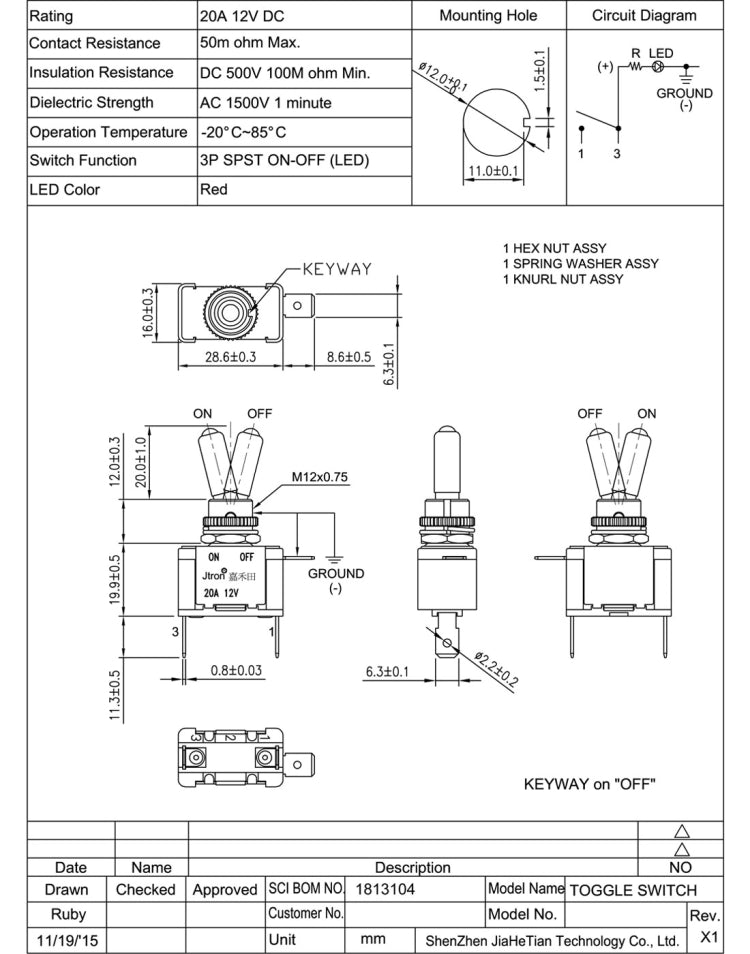 Jtron DV 12V Carbon Fiber Surface Panel Car Toggle Switch with Red LED Indicator