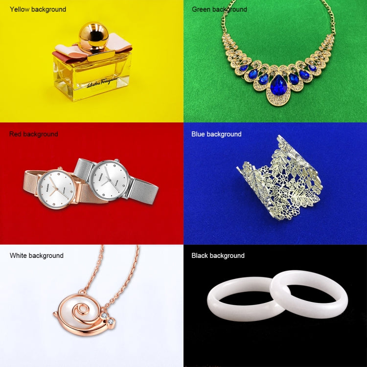 6. Replaceable background, with black/white/red/blue/yellow/green six-color background, can be used to shoot the desired background color according to different products