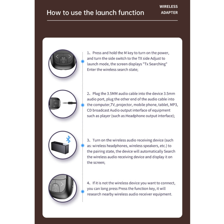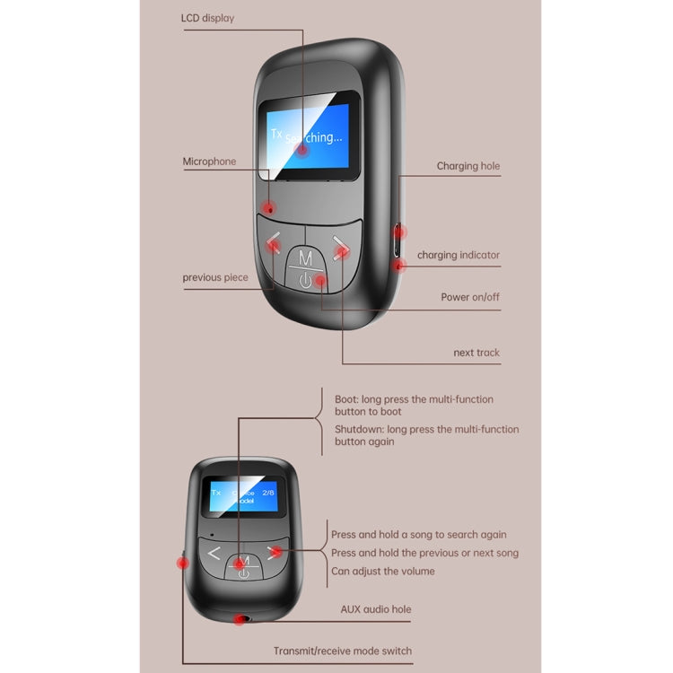 1. Function: bluetooth audio receiving and transmitting combo, LCD screen display, support hands-free call
