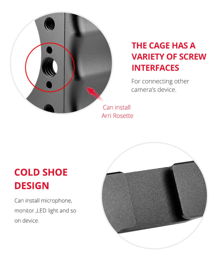 3. The cage frame with 1/4 and 3/8 threaded holes, cold shoe port, Arri Rosette positioning external interfaces, which is convenient for external equipment.