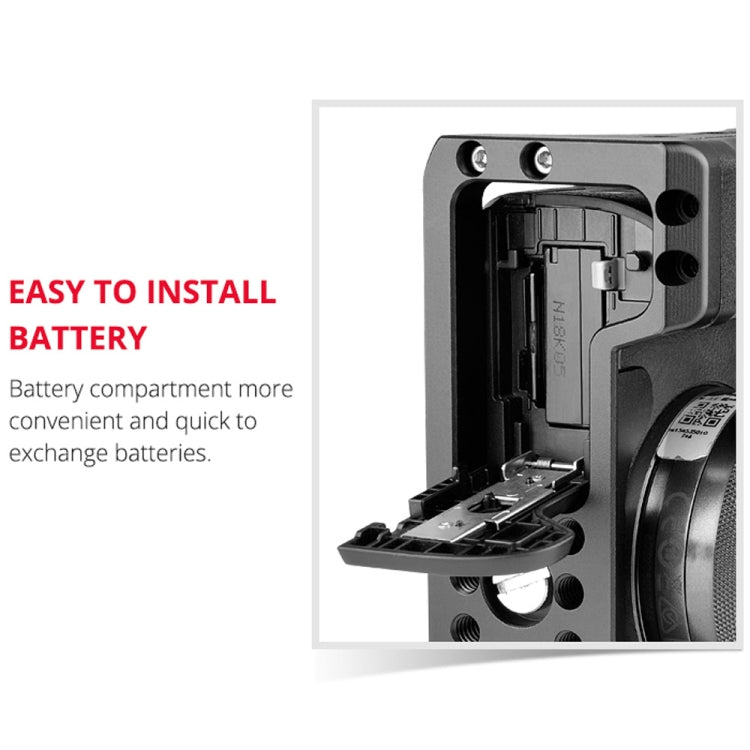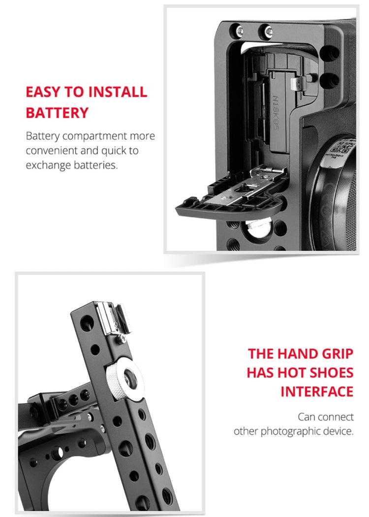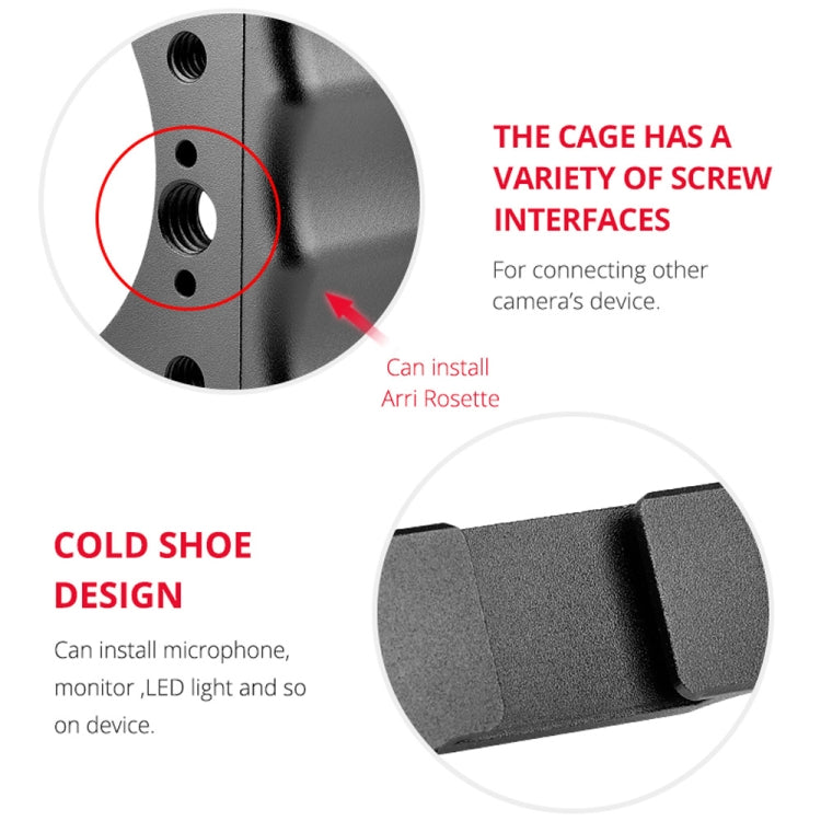 7. The cage frame with 1/4 and 3/8 threaded holes, cold shoe port, Arri Rosette positioning external interfaces, which is convenient for external equipment.